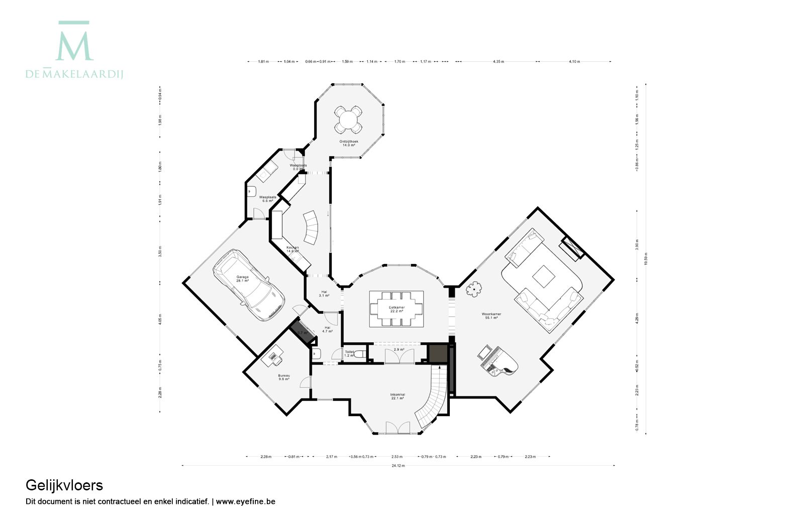 U komt binnen in de riante inkomhal met apart gastentoilet die door de vide zeer veel lichtinval geniet. Van hieruit komt u in de woonkamer waar u beschikt over een grote eetkamer en een prachtige zithoek met open haard. Vanuit alle ramen heeft u een prachtig uitzicht op de tuin