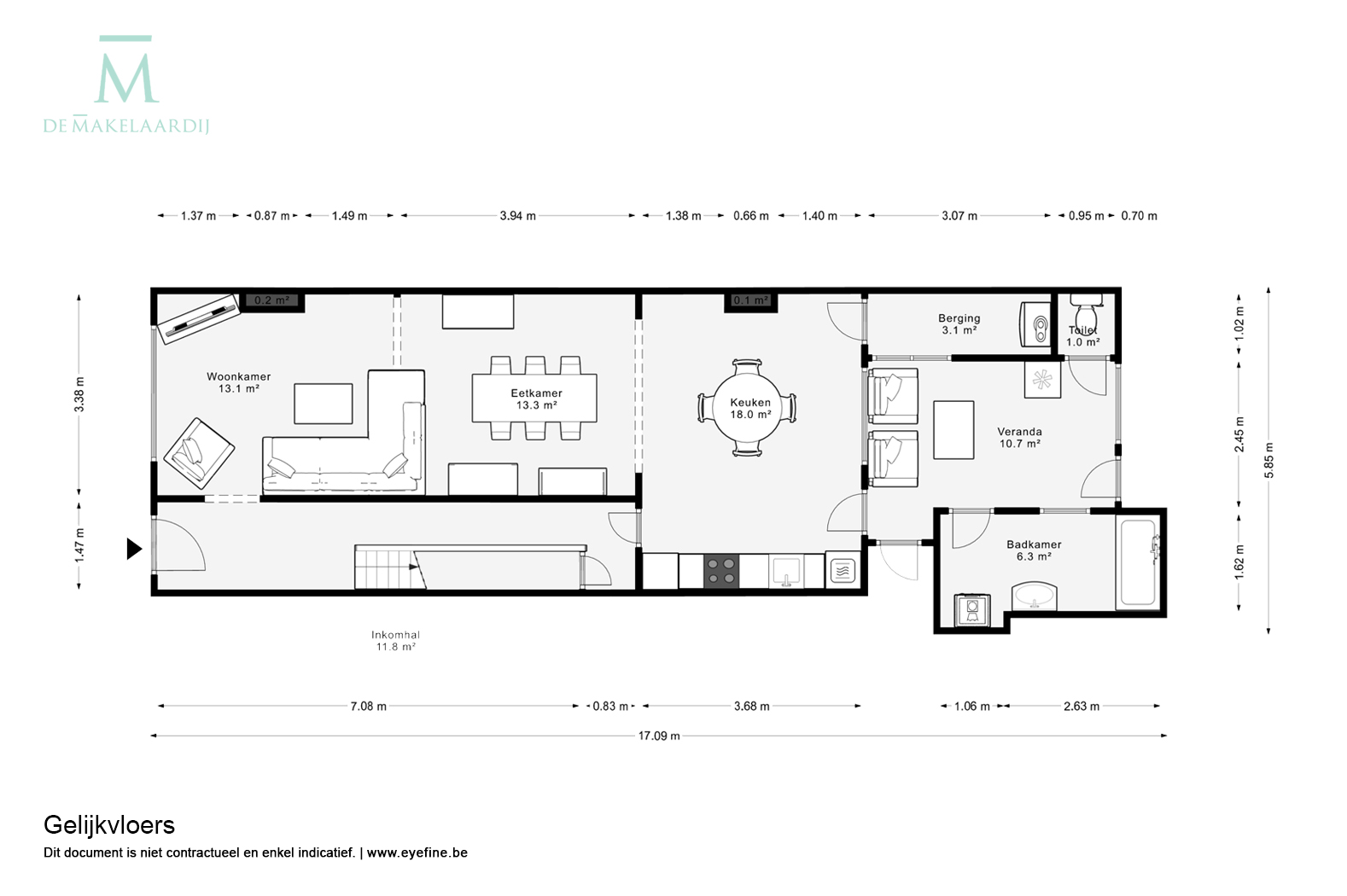 U komt binnen in de inkomhal vanwaar u toegang heeft tot de woonkamer of u kan ook langs hier de keuken betreden.
