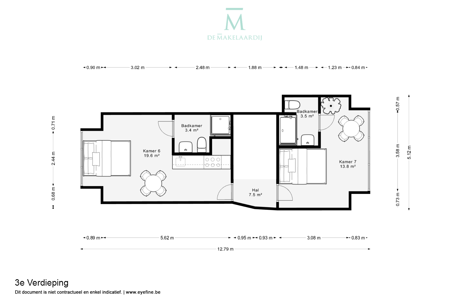 ·De studio heeft een totale oppervlakte van 19,5m² en omvat een aparte toilet alsook een aparte ruimte badkamer met douche, ingebouwde lavabo met lade en spiegel.
