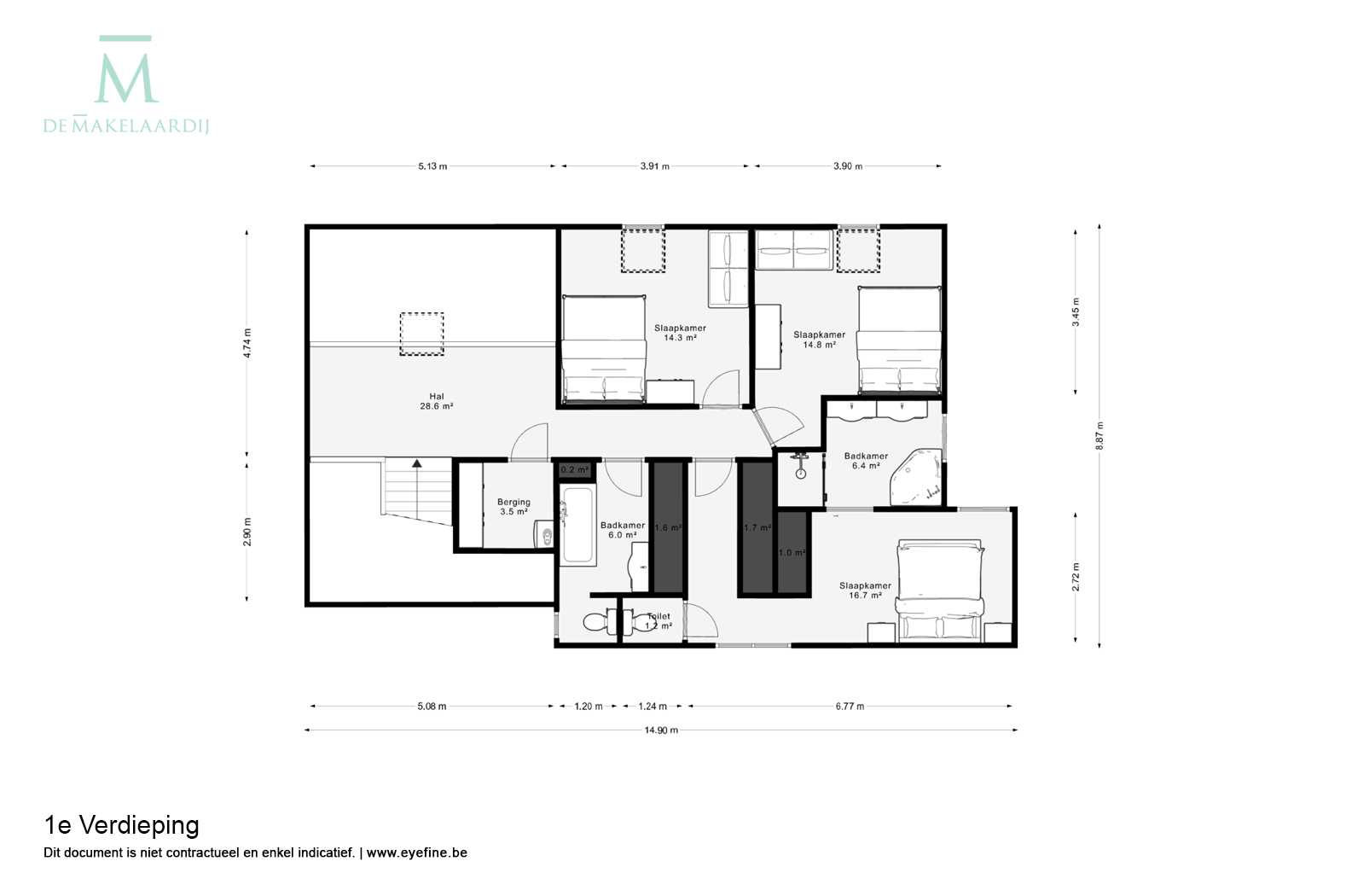 Op de eerste verdieping komt u via de palier, waar u een mooi uitzicht heeft over de woonkamer en de tuin. Hier beschikt u over 3 slaapkamers, waarvan de master bedroom beschikt over een eigen badkamer en dressing. Er is ook nog een tweede badkamer aanwezig en een handige (technische) berging.