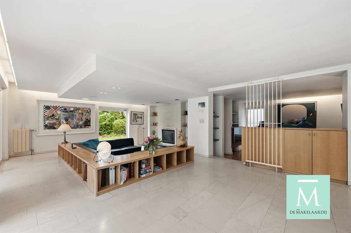 U betreedt de mooie inkomhal met apart gastentoilet en vestiaireruimte. Van hieruit komt u in de woonkamer waar u al dadelijk een prachtig uitzicht heeft over de mooi aangelegde tuin. Bovendien geniet u over heel de woonkamer en keuken van zeer veel lichtinval door de grote raampartijen. De riante leefruimte is opgedeeld in een grote eethoek en een gezellige salon, die door het feit dat het een zitkuil is, zeer veel gezelligheid biedt. Hier kan u ook genieten van een open haard, die het nog gezelliger maakt. Bovendien geeft deze open haard ook uit de TV hoek en een praktische kantoorruimte met ingebouwde kasten.
