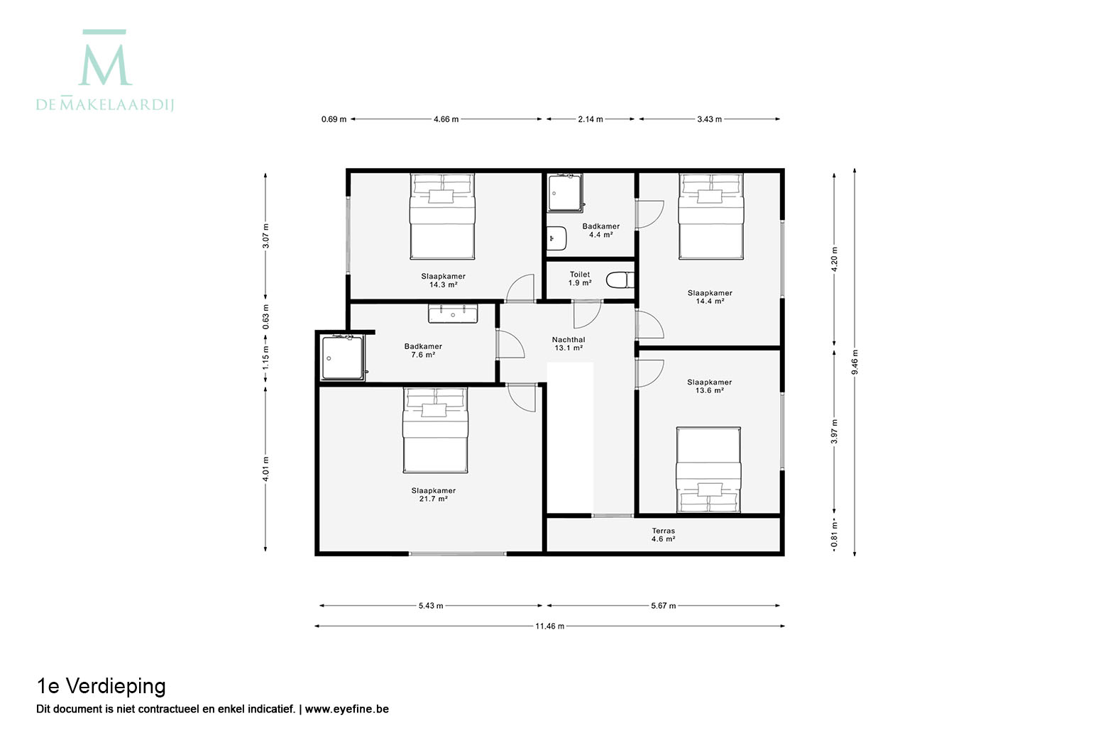 Op de verdieping bevinden zich 4 zeer ruime slaapkamers, waarvan 1 met een eigen badkamer, een tweede badkamer in de nachthal en een apart toilet.